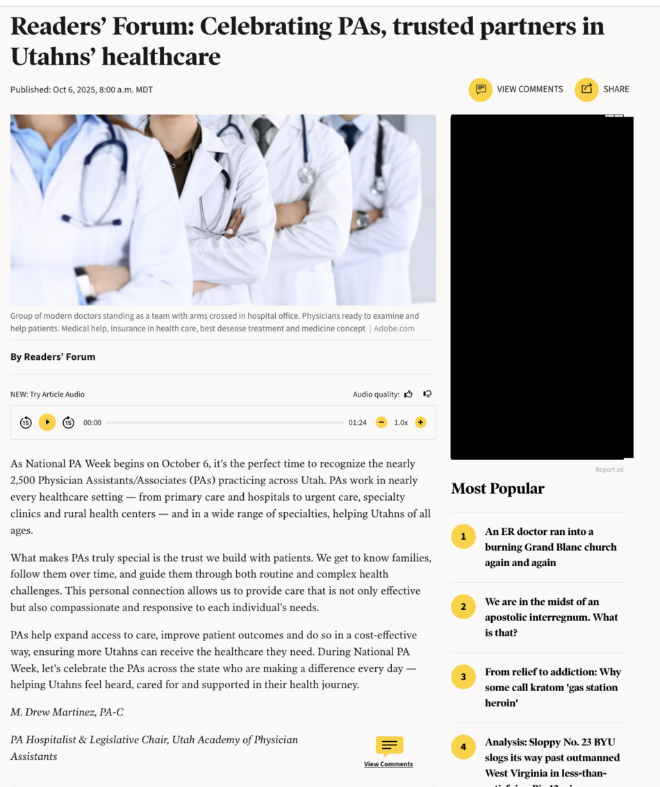 "Readers’ Forum: Celebrating PAs, trusted partners in Utahns’ healthcare": Editorial By Drew Martinez in Today's Deseret News